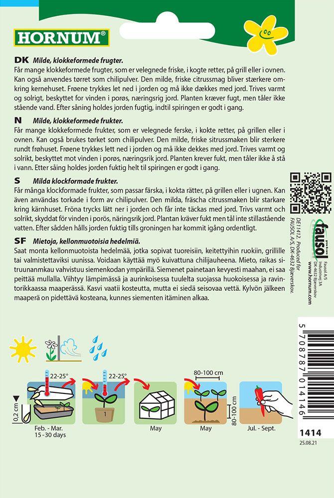 Kasvattaa kauniin punaiset, kellomaiset hedelmät, joilla on chiliksi mieto ja raikas maku. Sopii käytettäväksi tuoreena ja kypsennettynä. Tulisuus 5000-30 000 Scovillen asteikolla. Kasvukorkeus n. 125 cm. Esikasvatettava. Yksivuotinen. Siemenpussista löydät selkeät kylvö- ja viljelyohjeet.