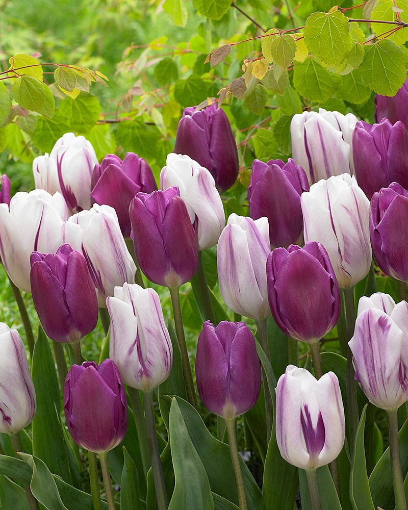 Pakkaus sisältää 20 sipulia: 10 kpl valkoviolettia 'Flaming Flag' ja 10 kpl violettia 'Purple Flag' -tulppania.