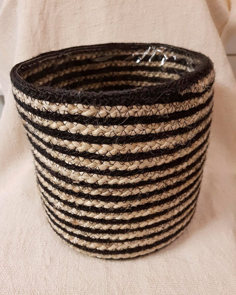 Kauniilla juuttikorilla saat pehmeää ilmettä kukkaistutuksiin. Mustaraitainen juuttikori sisältää muoviruukun. Korin halkaisija on 20 cm.