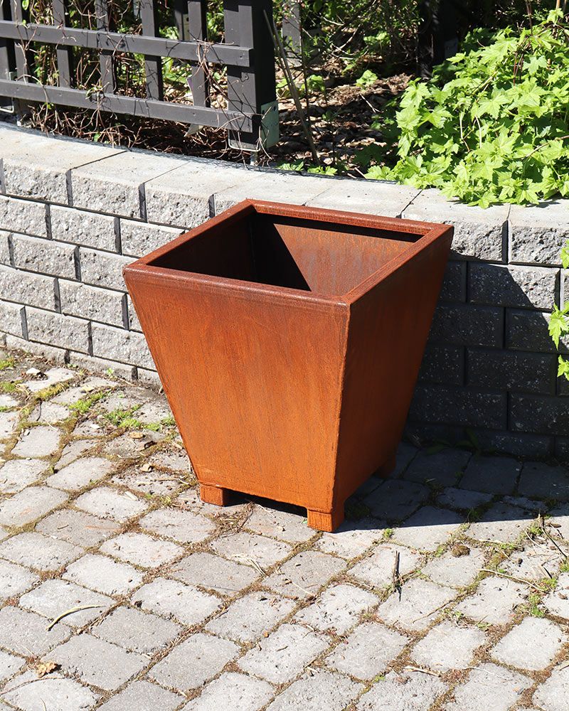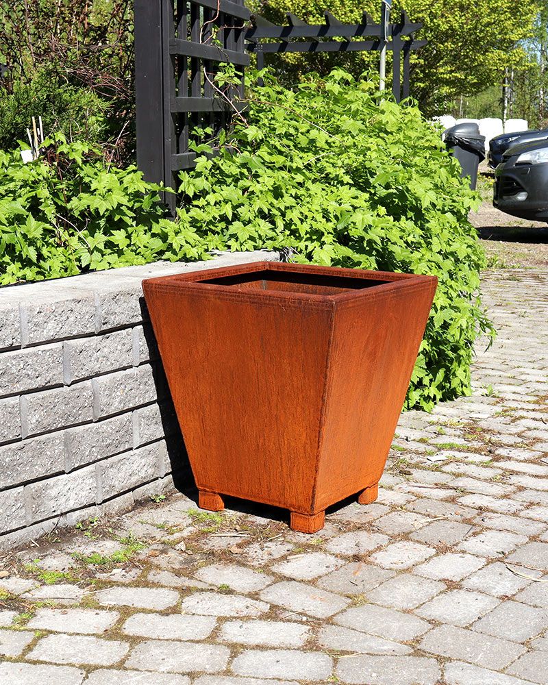 Corten-teräs on säänkestävä ja pitkäikäinen materiaali, johon kehittyy ajan myötä kauniin luonnollinen ruosteinen patina, joka suojaa materiaalia korroosiolta ja tekee myös jokaisesta ruukusta yksilöllisen. Ruukku soveltuu ulkokäyttöön ympäri vuoden. Pohjassa on valmiit reiät vedenpoistolle. Materiaalin paksuus 2 mm. Ruukun koko 50 x 40 cm.