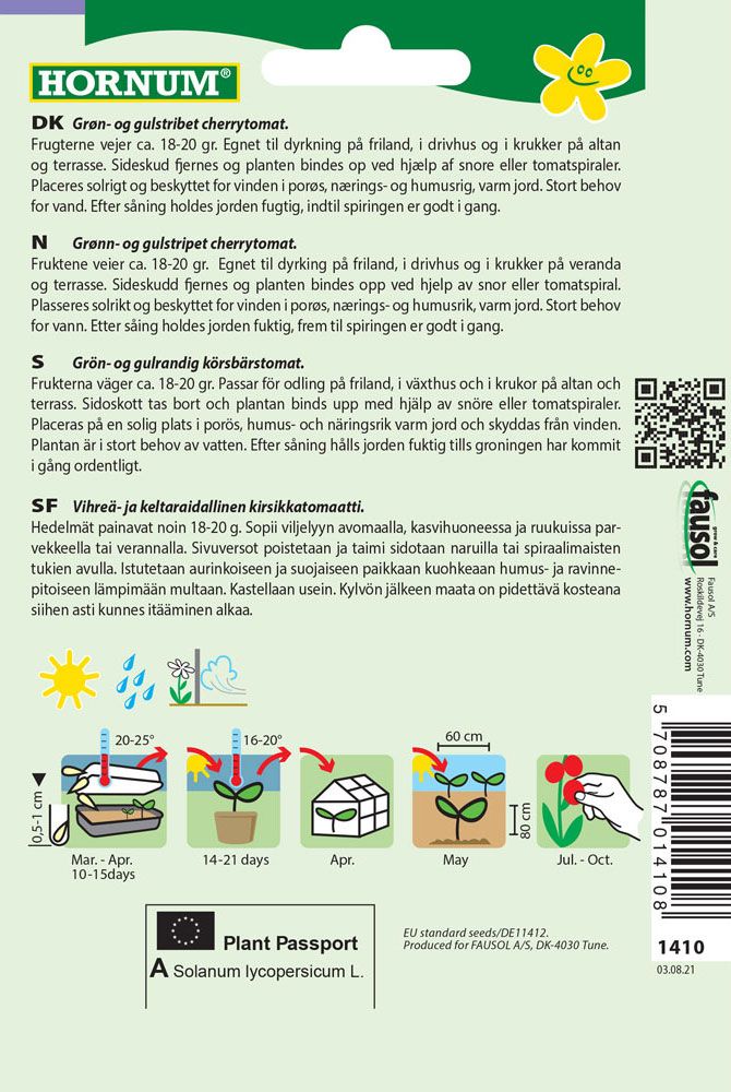 Hieno kelta-vihreäraidallinen lajike monipuoliseen ruoanlaittoon ja säilöntään. Hedelmät eivät halkeile helposti. Vaatii tuen versoilleen. Lehtihankoihin kasvavat varkaat poistetaan. Kasvukorkeus n. 150 cm. Esikasvatettava. Yksivuotinen. Siemenpussista löydät selkeät kylvö- ja viljelyohjeet.
