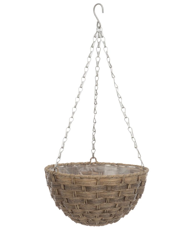 Tyylikäs polyrottinkinen vaaleanruskea amppeli, jota kannattelee metalliketjut. Muovitettu sisäpinta. Amppeli on halkaisijaltaan 25 cm ja sen korkeus on 13 cm.