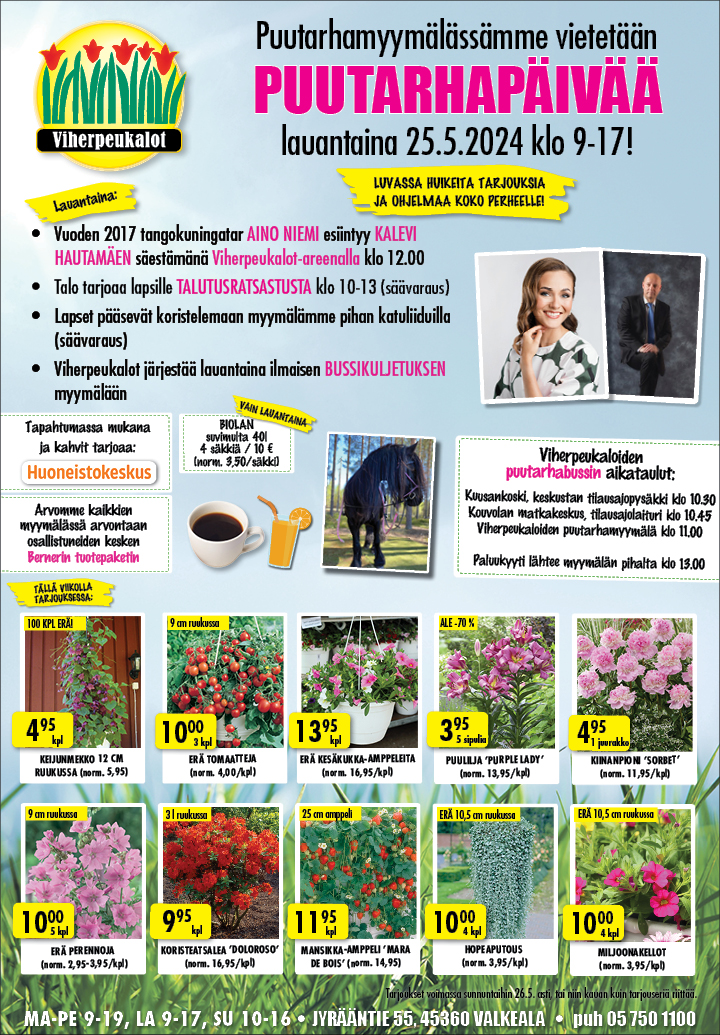 Viherpeukalot järjestää lauantaina asiakkailleen ilmaisen bussikuljetuksen puutarhamyymälään. Reitti kulkee Kuusankoskelta Kouvolan matkakeskuksen kautta myymälälle.