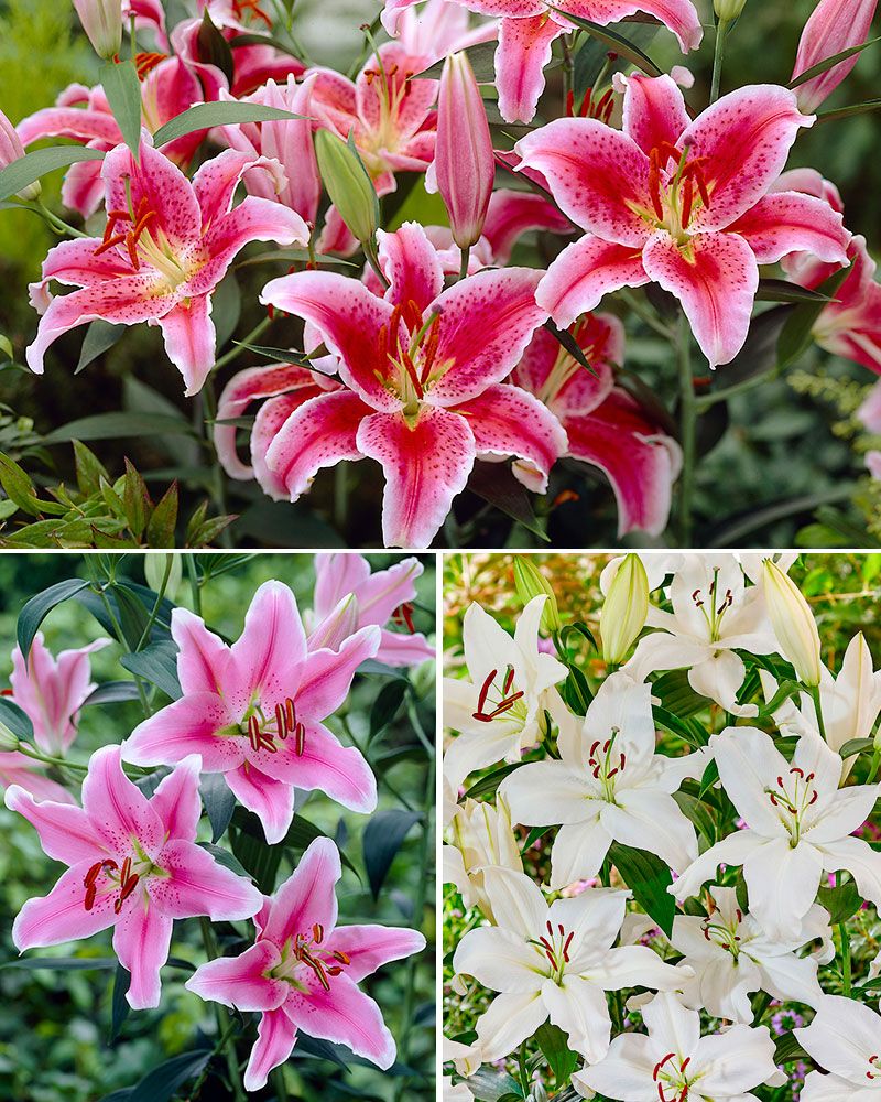 Pakkaus sisältää yhteensä 30 sipulia: 10 kpl ´Snowy Mountain´ -, 10 kpl ´Sorbonne´ ja 10 kpl ´Stargazer´-liljoja.