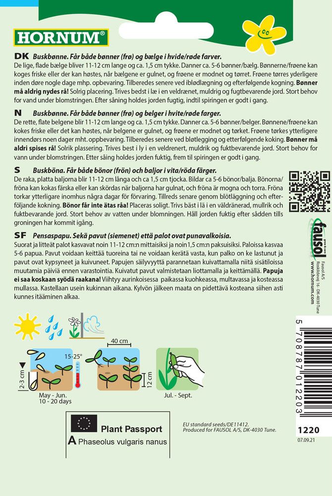 Tuottaa punavalkoisia palkoja ja siemeniä. Suorat ja litteät palot kasvavat 11–12 cm pitkiksi ja n. 1,5 cm paksuisiksi. Kasvattaa 5–6 papua/palko. Siemenet voidaan keittää tuoreina tai kerätä vasta, kun palot ovat kellastuneet ja siemenet kypsyneet. Yksivuotinen. Siemenpussista löydät selkeät kylvö- ja viljelyohjeet.
