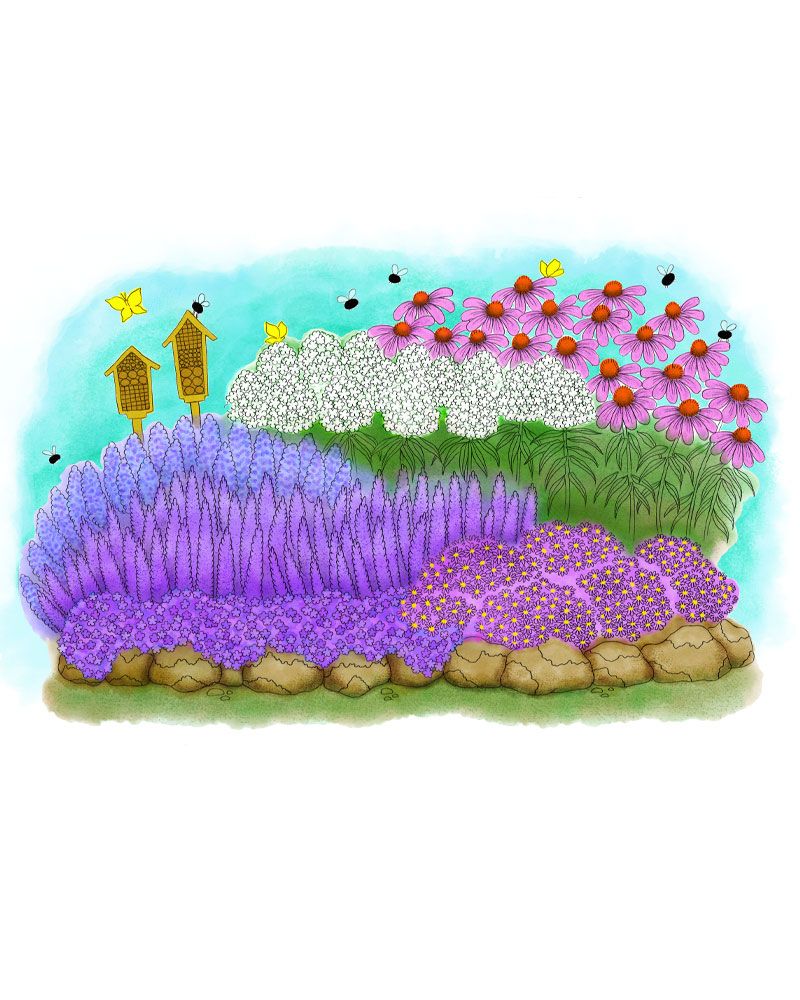 Pörriäiskeidas on ihastuttava perennakokonaisuus herkullisia purppuran, lilan ja vaaleanpunaisen sävyjä, joita valkoinen valaisee. Kauniskukkaiset perennat ilahduttavat katsojaansa houkutellen samalla perhosia ja muita pölyttäjiä.