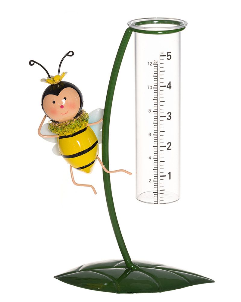 Helppokäyttöisen itsestään pystyssä pysyvän sademittarin voi asettaa mille tahansa tasaiselle alustalle, vaikkapa terassille pöydän päälle. Metallisen sademittarin varressa kieppuu söpö mehiläinen. Lasisen mitta-astian kyljessä on asteikko, josta luetaan sateen määrä. Mitta-asteikko 12 cm/5 tuumaan asti. Sademittarin kokonaiskorkeus on 21 cm.