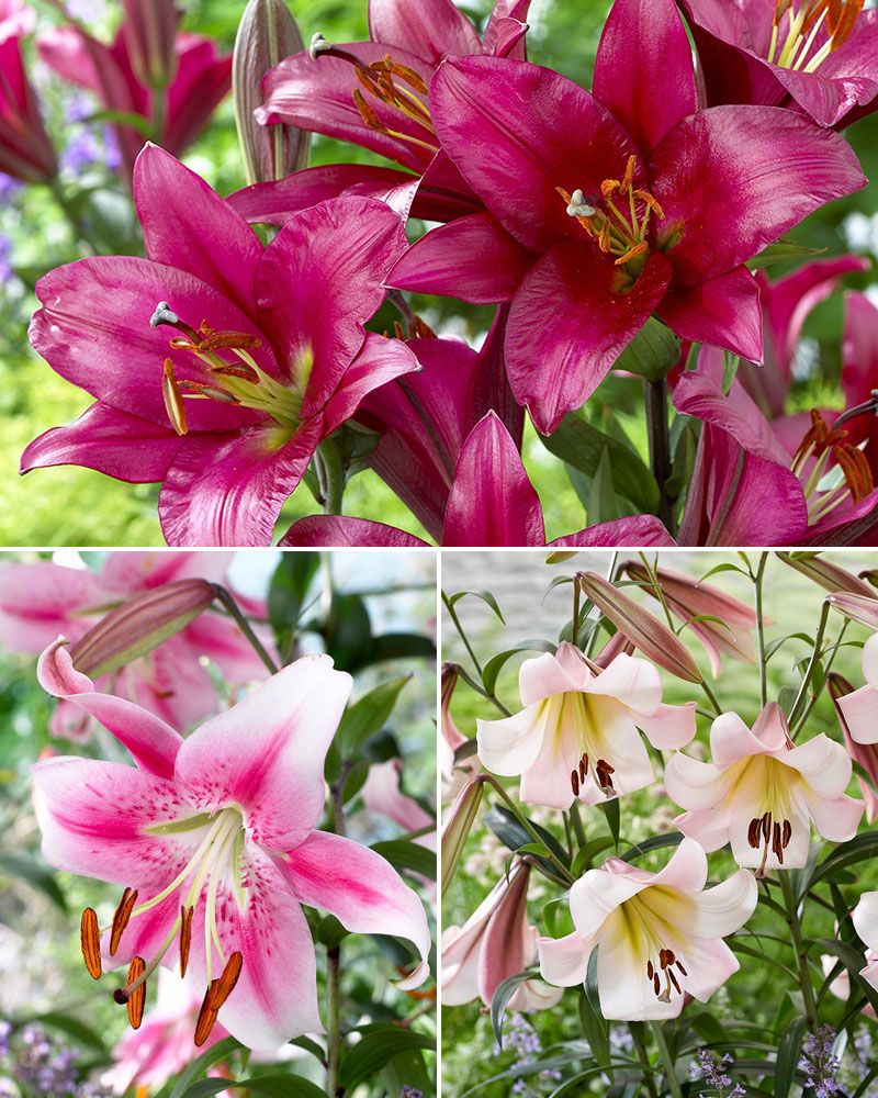 Pakkaus sisältää yhteensä 15 sipulia: 5 kpl 'Anastasia'-, 5 kpl 'Eastern Moon' - ja 5 kpl 'Purple Prince' -puuliljoja.