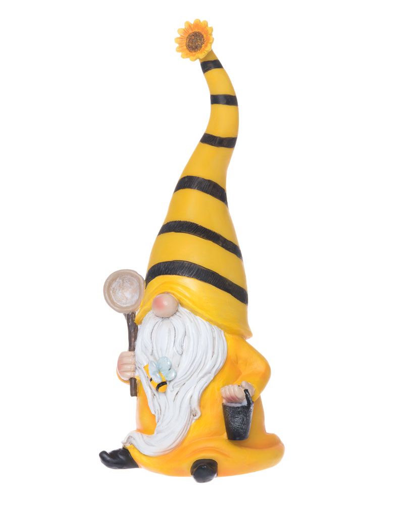 Somista pihasi, terassisi tai parvekkeesi persoonallisilla pihakoristeilla. Ne tuovat tunnelmaa ja ilahduttavat sinua päivittäin. Keltaisen raitahattuisen puutarhatontun kädessä on haavi. Materiaali polyresiini. Suositellaan siirtoa sisätiloihin talven ajaksi. Patsaan koko on noin 10 x 25 cm.