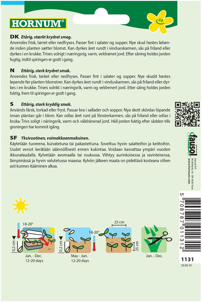 Voimakkaasti mausteinen basilika. Voidaan käyttää tuoreena, kuivattuna tai pakastettuna erilaisiin ruokiin. Viihtyy aurinkoisella, lämpimällä kasvupaikalla ja sopii kasvatettavaksi sekä avomaalla että ruukussa. Siemenet kylvetään sisällä ja taimet siirretään ulos vasta alkukesän kylmien jälkeen. Satoa saadaan koko kasvukauden. Kasvukorkeus 30-40 cm. Yksivuotinen. Siemenpussista löydät selkeät kylvö- ja viljelyohjeet.