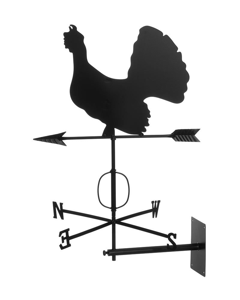 Komea metso-tuuliviiri näyttää tuulen suunnan. Tuuliviirissä on ilmansuunnat ja nuoli. Metson koko noin 33 x 32 cm, varren pituus 50 cm. Sisältää kiinnityslevyt sekä harjakattoon että suoralle pinnalle sivusta. Tuuliviirin materiaali metalli, väri musta.