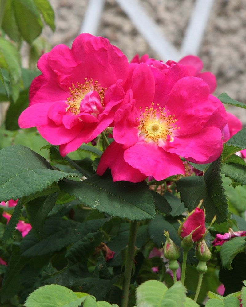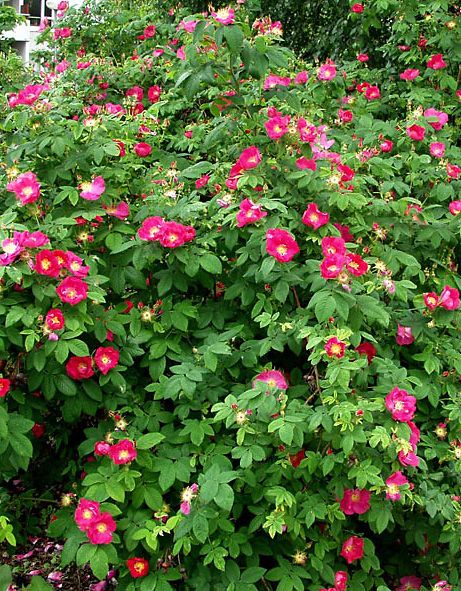 Kolmisen viikkoa kestävä kukinta voi alkaa lämpimänä kesänä jo kesäkuun lopussa. Puolikerrannaiset, 6-7 cm leveät kukat avautuvat edellisen vuoden versoihin. Pystykasvuisen ruusupensaan edellisen vuoden versot ovat vihreät tai ruskehtavat ja keskikokoiset lehdet ovat terveet. Päärynänmuotoiset kiulukat eivät yleensä ehdi kypsyä punaisiksi. Juurivesoja muodostuu melko runsaasti. Pensasruusuja leikataan yleensä nuorentamalla. Varhain keväällä voi poistaa vanhimpia ja heikosti kukkivia oksia.